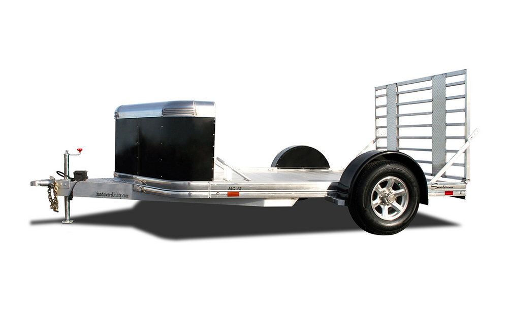 The MC12 utility trailer from Sundowner combines the popular utility model and the car hauler model to bring you a trailer fit specifically for your motorcycle hauling needs. The protective air dam shields your bike from rock and road debris while the wheel chocks maintain your load position. This 6’9” wide, all aluminum trailer is 12ft long with a heavy duty 48” utility ramp. The 2 treadplate ramp strips ensure safe loading and unloading with ease. Flip the LED load light that’s mounted on the back of the 10” bump rail so you can see to secure your bike after your ride. This package can be tailored to fit your needs or painted to match your bike; we encourage customization!