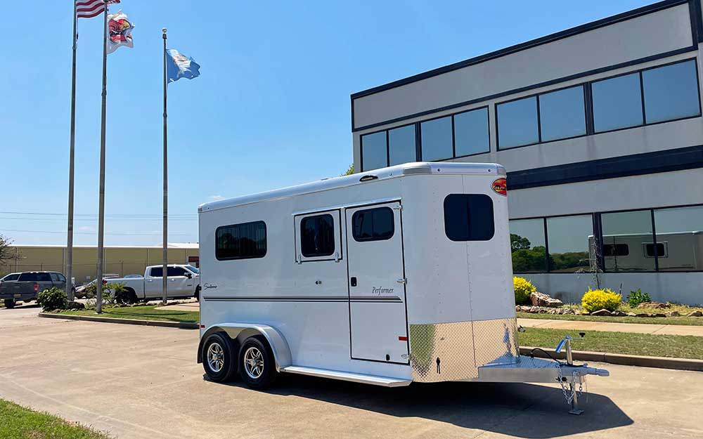 The Performer Bumper Pull is a 2 horse straight load trailer with a large tack storage room and tons of extra features. It comes standard with large sliding windows in the horse area, a divider between the stalls, feed mangers for each stall with a pass thru door, and is 7’6” tall. The Performer also has two sliding windows in the nose of the trailer and windows in the rear tail curtains.
